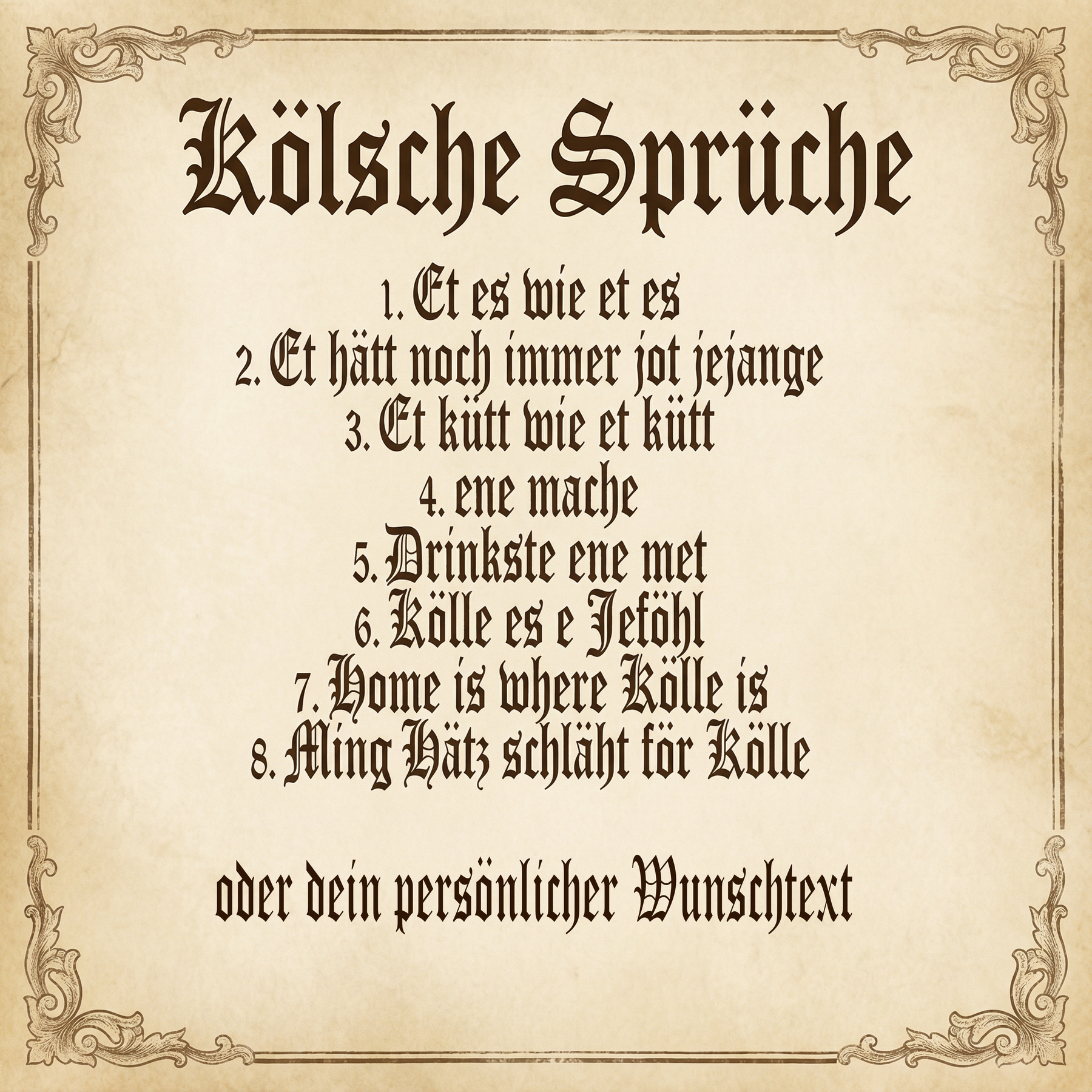 Über die Variante Spruch kannst du aus beliebten kölschen Sprüchen auswählen, zum Beispiel: